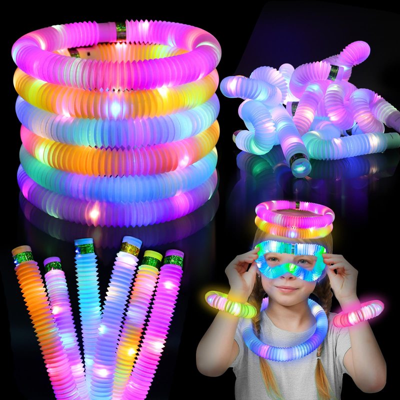 - Light Up Party Favors for Kids - Combining pop fidget tubes and multi-color LED lights, glow sticks are no longer an exclusive fidget sensory toys and learning toy for toddler, pop tubes fidgets toy have been played with in creative ways, light up your celebration time, even decorate your glow-in-the-dark party. This glow stick fidget party favors set comes with 18 sensory tubes in a box.