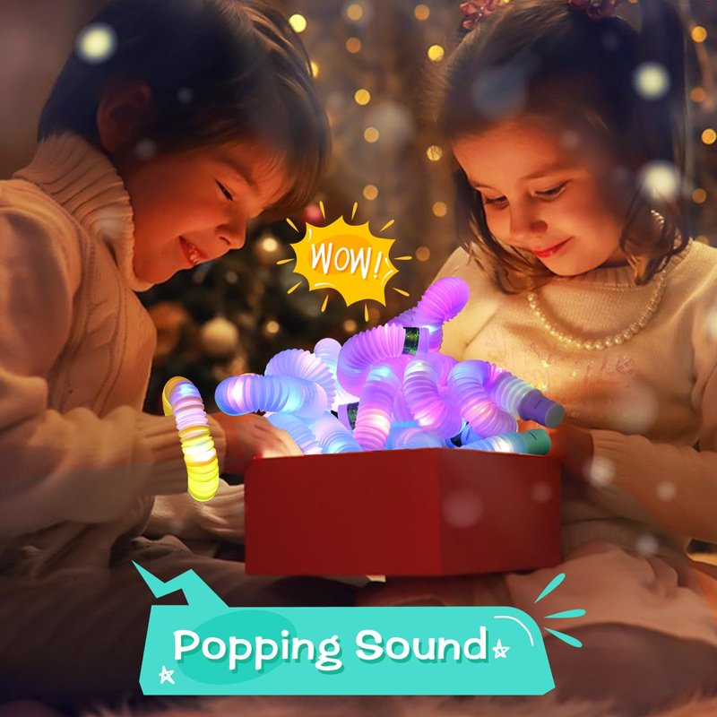 - Light Up Party Favors for Kids - Combining pop fidget tubes and multi-color LED lights, glow sticks are no longer an exclusive fidget sensory toys and learning toy for toddler, pop tubes fidgets toy have been played with in creative ways, light up your celebration time, even decorate your glow-in-the-dark party. This glow stick fidget party favors set comes with 6 sensory tubes in a box.
