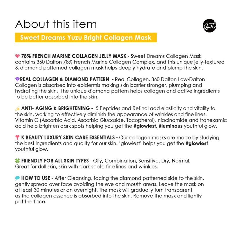 - 💭 HOW TO USE- After Cleansing, facing the diamond patterned side to the skin, gently spread over face avoiding the eye and mouth areas. Leave the mask on at least 30 minutes or an overnight. The mask will gradually turn transparent as the collagen essence is absorbed into the skin. Remove the mask and lightly pat the face.