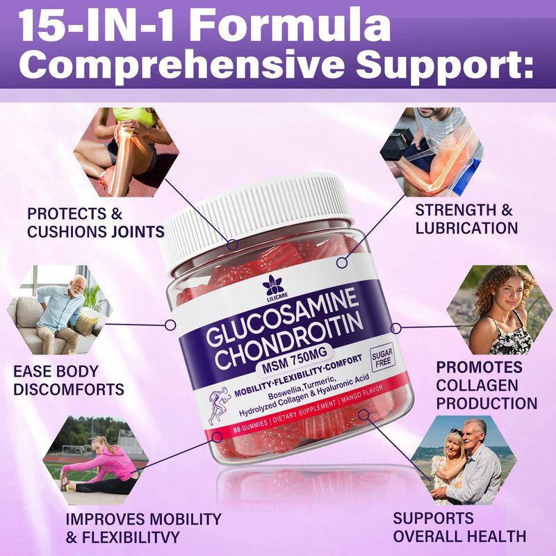 - 15-IN-1 Powerful Joint Support Supplement: Meticulously formulated by our team, that combines with high potency, optimal absorption, and carefully crafted. By consuming just two gummies daily, you will get 1500mg Glucosamine, 200mg Chondroitin, 750mg MSM, 300mg Boswellia, 150mg Turmeric, and many other essential ingredients! They work together to help reduce joint discomfort including lack of flexion, joint stiffness and weakness.* Glucosamine gummies contribute to cartilage maintenance.