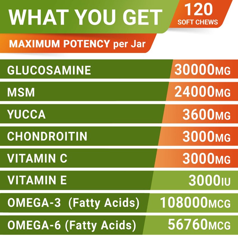 - Natural Premium Ingredients - each soft chew contains a complex of Glucosamine, Chondroitin, MSM and Omega rich Fish Oil among active ingredients for joint support for dogs, strong bones, improve doggy's energy and mobility.