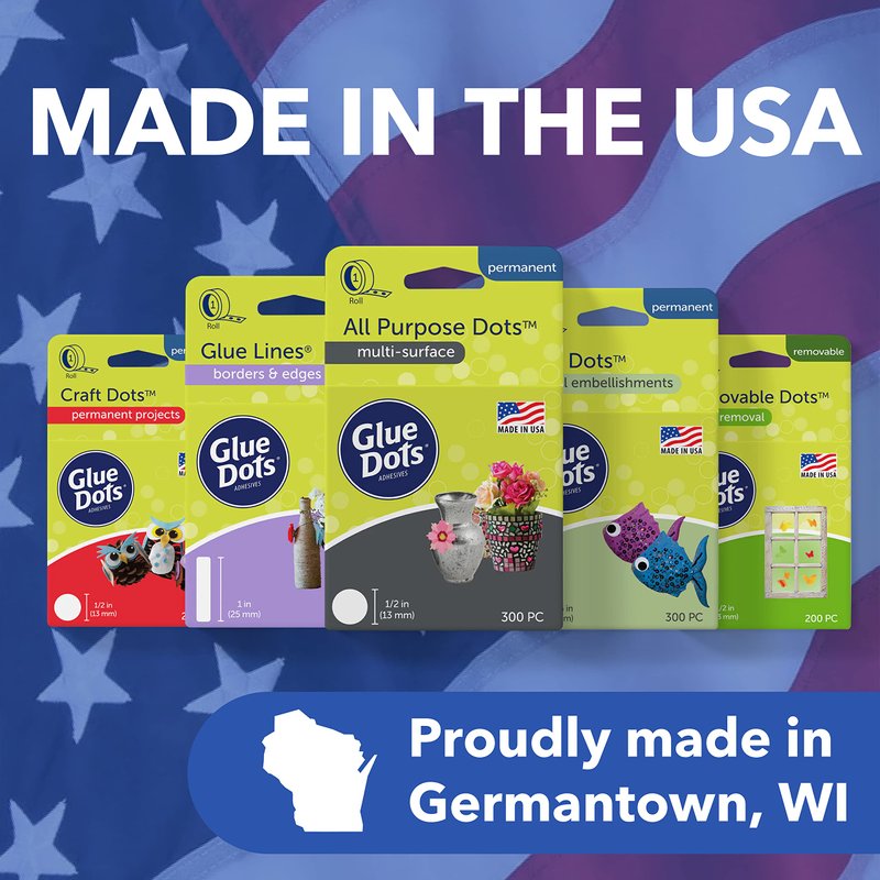 - MADE IN THE USA: All of our adhesives are created from concept to product in Germantown, Wisconsin. Glue Dots is proud to design and manufacture all of our adhesives in the USA!