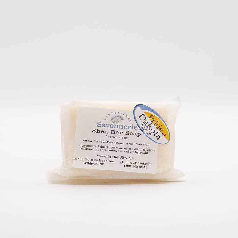 A new addition to our list of coconut free products, our Shea Bar Soap is 100% natural and handmade in our small rural facility. It is creamy and lathers well, allowing for a wide variety of uses. We have used the tried and tested Babassu Bar Soap from our Dakota Free product line as a base for this incredibly effective bar. The substitution of the babassu oil for the shea butter allowed us to bring a coconut free soap to our Gluten Free Savonnerie line, while also utilizing the many benefits of shea butter. In Shea Bar Soap, the natural glycerin is kept intact; glycerin has a moisturizing effect on both skin and hair and is very desirable in soap. At Gluten Free Savonnerie Products we take the integrity of our products seriously and track the allergen status of our ingredients so that you can use the products with confidence. This unscented product is ideal for anyone who wishes to avoid synthetic chemicals, including those with environmental illness, chemical sensitivities or TILT (Toxicant-induced Loss of Tolerance). Chemical Free bath & skincare Product for a Healthier Life. Every Gluten-Free Savonnerie Produnt is gluten-free and wheat-free. They are the perfect skincare line for those with Celiac Disease, Dermatitis herpetiformis or a wheat allergy. Nontoxic, unscented skincare and bath products that are ideal for anyone who wishes to avoid synthetic chemicals, including those with environmental illness, chemical sensitivities or TILT (Toxicant-induced Loss of Tolerance). Ingredients: Palm oil, palm kernel oil, distilled water, safflower oil, 100% pure shea butter (Butyrospermum parkii) and sodium hydroxide.