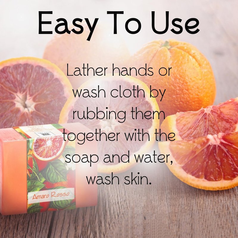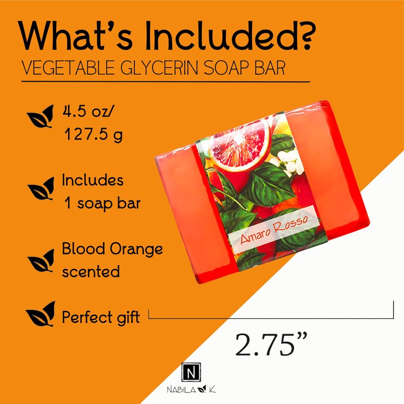 - Includes: 1 Amaro Rosso glycerin bar soap (blood orange scent)