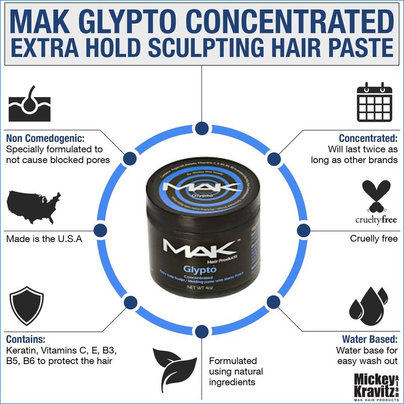 MAK Hair Products from Mickey Alan Kravitz 'Glypto" hair paste is a concentrated extra hold hair paste for men and woman. If you want the extream to conservative look you can achieve that from MAK 'Glypto" Glypto hair paste is concentrated and only take a small amount with a drop of water or use on damp hair. Define yourself with MAK Hair Products. All MAK Hair Products are made in the U.S.A