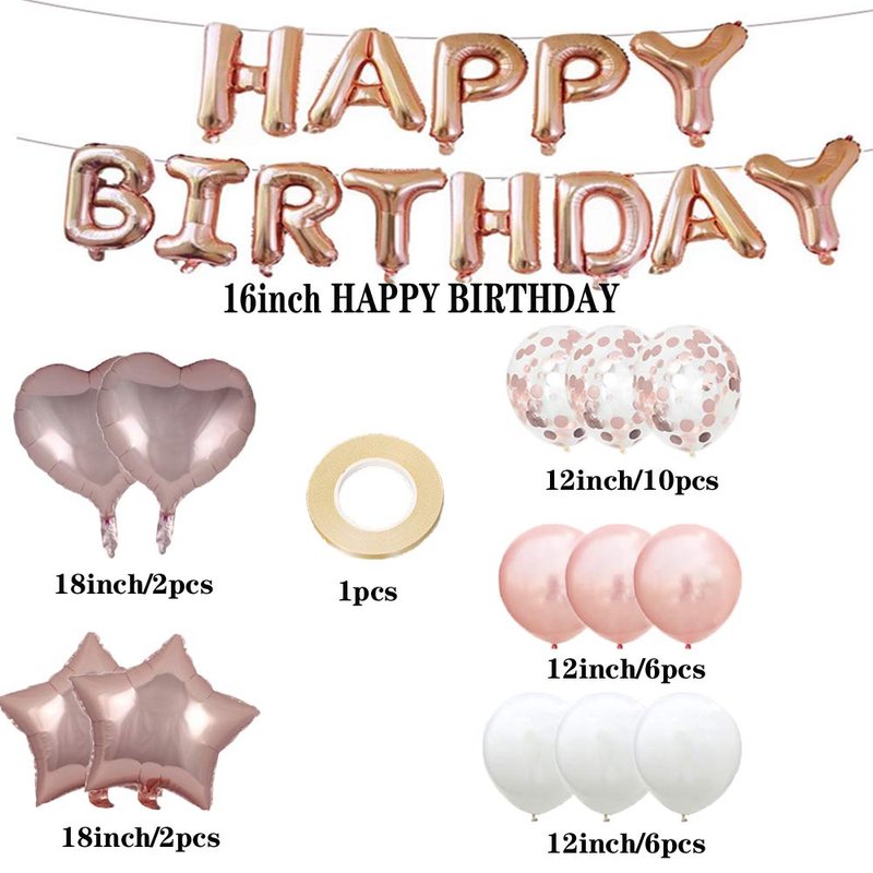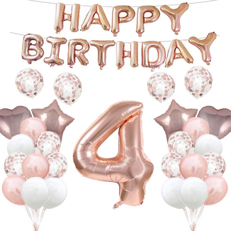 - Happy 4th Birthday Party Supplies :Package includes 40 inch rose gold foil balloons "4" set, 16 inch "HAPPY BIRTHDAY " banner balloons,2pcs 18 inch mylar star balloons,2pcs 18 inch mylar loving heart balloons,10 pcs confetti balloons and 12pcs latex balloons(6pcs rose gold latex balloons and 6pcs white latex balloons)