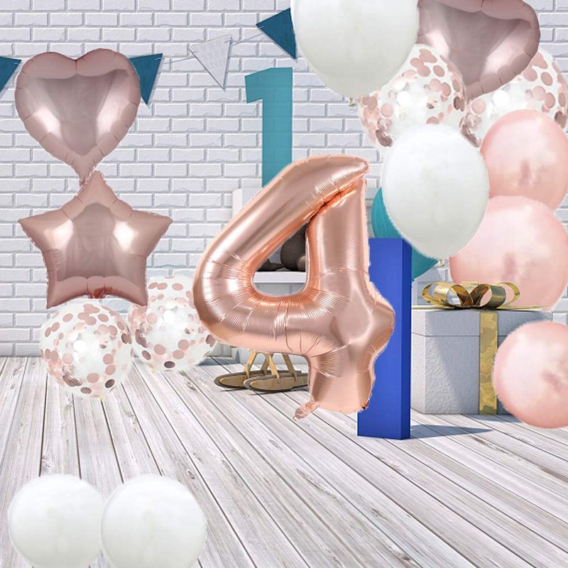 - Number 4 Balloons:These large number 4 rose gold balloons bundle will complete your rose gold birthday party supplies.Wipe the inflated balloon with paper, wool, or carpet so that the confetti can hold the balloon tightly.If you use air, they will not float(PLEASE USE HIGH QUALITY HELIUM TO FILL YOUR CONFETTI BALLOONS)