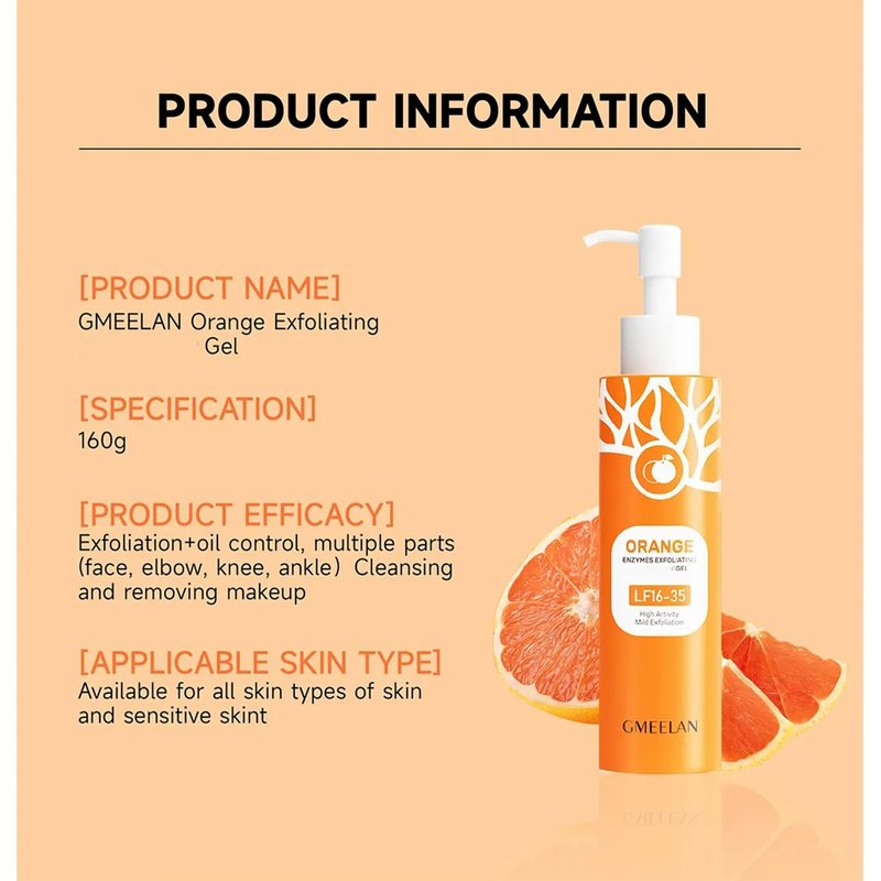 Gmeelan Orange Enzymes Exfoliating Face skin care Moisturizing Gel , Size 5.6 Fl oz ( Pack Of 1 ) . Gmeelan orange face gel a luxurious skincare solution designed to unveil a radiant and youthful complexion. Infused with the power of natural orange enzymes, this exfoliating gel gently removes dull, dead skin cells, revealing a glowing and more luminous skin tone. Say goodbye to uneven skin texture and embrace a smoother, rejuvenated feel that leaves you with a refreshed and glowing appearance. this gel helps diminish dark spots and resulting in a more uniform and illuminated skin tone. For daily use, this product can help control oil and keep your skin looking fresh throughout the day, preventing your face from turning into an oily and reflective surface. HOW TO USE: Before use , keep face and hands dry. Apply an appropriate amount of exfoliating product to the desired areas and massage in circular motions with your fingertips until the old dead skin cells are rubbed off. Rinse off with clean water.