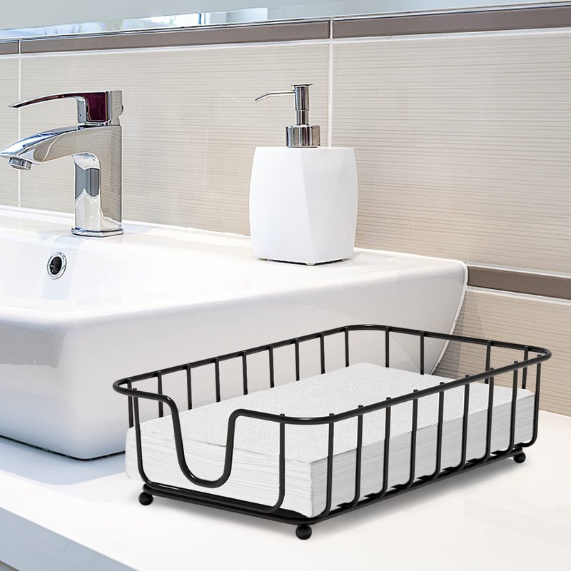 - Keep your disposable hand towels organized and easily accessible with this sleek black bathroom napkin holder tray.
