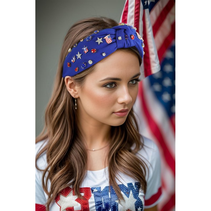 - Fourth of July Headband: Looking for an unique way to showcase your love and passion for the USA? Feast your eyes on this American Flag Headband! Embellished with red, white and blue rhinestones, stars, American flags, USA letters, bows, and heart charms, this jeweled headband is the ideal hair accessory for patriotic enthusiasts. Designed with a stylish wide knot top, all the accents are hand-made and securely glued on the headband, adding a touch of glamour to your hair on Independence day