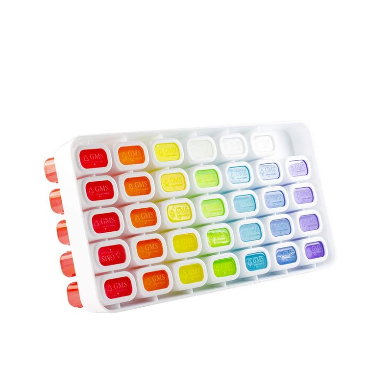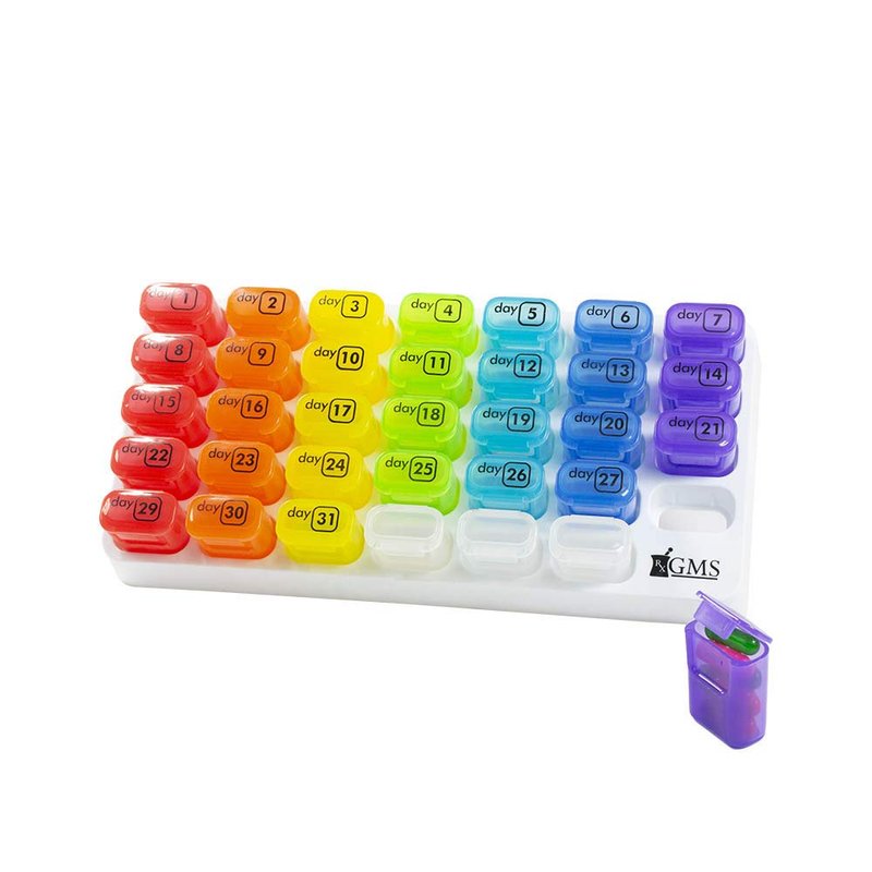 The New Generation of the GMS 31 Day Pill Box Organizer Provides Many Improvements. The pocket pill pods in this tray are now more durable and come with an improved latching system for storing your medication. Previously, dropping a pocket pill pod might result in spilled medication. Now, the latches on these pill pods are able to withstand being dropped. They can also handle more movement in bags without coming open. Losing one of your pocket pill pods is also no longer a concern. The GMS 31 Day Pill Box Organizer now comes with 3 extra pocket pill pods. This gives you additional flexibility in your medication management and provides you with replacements if you happen to lose one of the pods. In addition, the plastic used in our new 31 day pill organizer and pill pods is more durable and has a smoother feel than our previous editions of the product that provides a noticeable upgrade in quality. Simplify your medication compliance and make it convenient and hassle-free. The GMS Monthly Pill Pod Organizer is BPA-free plastic, secure, durable and easy-to-use. This monthly pill organizer comes in the popular Rainbow color scheme and offers organization through 31 labeled pill pods. The pocket pill pod compartments are small enough to easily fit in your purse, pocket, or any travel bag. In addition, each lid snaps tightly shut to prevent any spills and can be easily popped out for on-the-go convenience. They are very discreet and can hold vitamins, supplements, prescription, medication, fish oil, vitamin C, and more. The ability to remove the pocket pill pods from the 31 day organization tray provides the convenience to bring your medications with you. Don't worry about carrying your medication in multiple bottles or large containers with you to work anymore. Just grab your daily pocket pill pod out of the tray and hit the road!