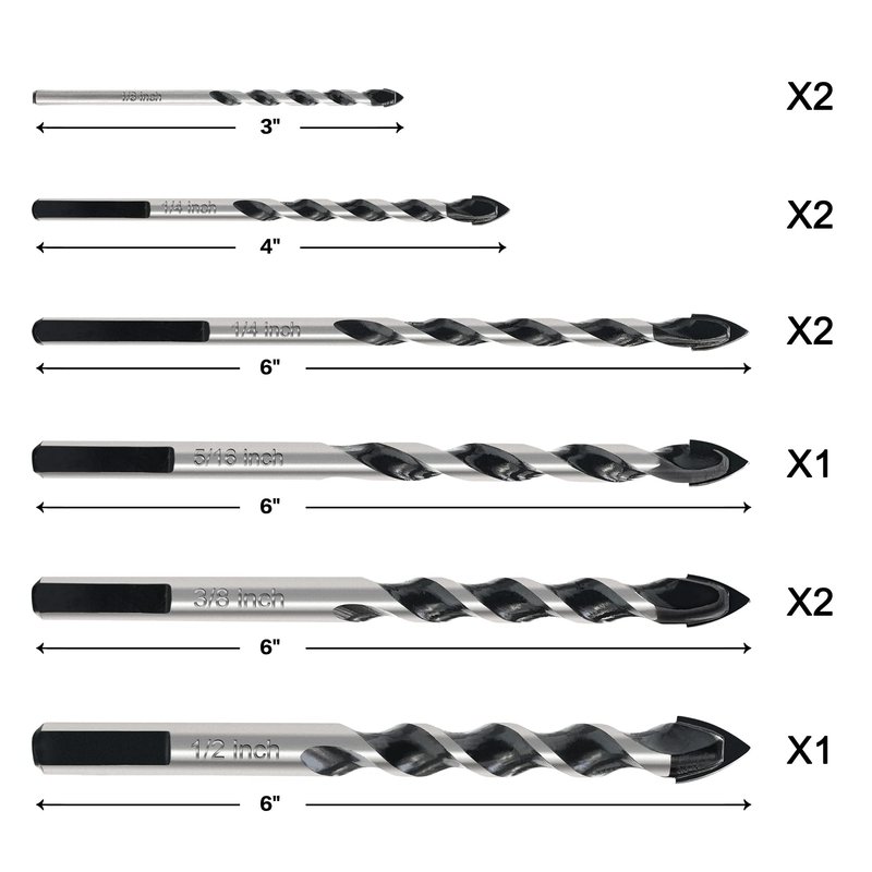 - [Size]:The masonry drill bit set includes 1/8" (3 inch length - 2 included), 1/4" (4" length - 2 included), 1/4" (6" length - 2 included), 5/16 (6" length), 3/8" (6" length - 2 included), and 1/2" (6" length). placed in a hard plastic container.