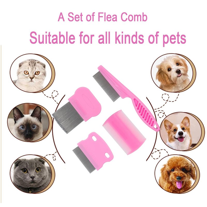 You will get total 4 different kinds of combs, use in different kinds of pets, such as dog, cat etc most of the house pets. Package List: 1Pcs stainless steel high strength teeth comb with strong plastic grip blue 7.08 * 1.18 in , 1Pcs double sides strong plastic comb 3.54 * 2.16 in , 1Pcs long stainless steel teeth comb 3.54 * 1.96 in , 1Pcs short stainless steel teeth comb 2.04 * 2.36 in