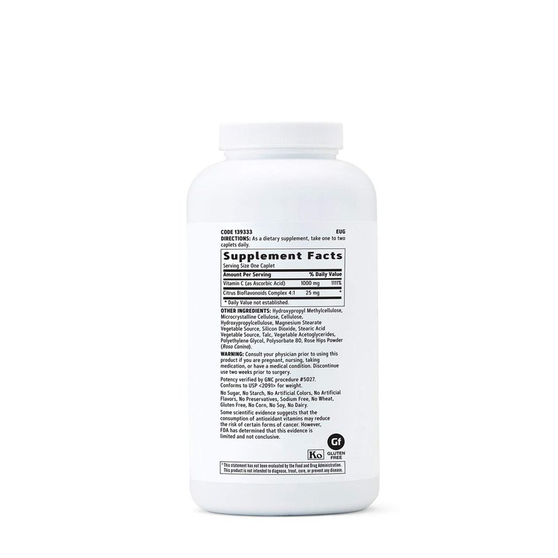 - GNC Vitamin C 1000 mg - Timed-Release If you’re looking for a convenient way to receive the benefits of immune support, you can add GNC Vitamin C 1,000 mg to your daily dietary supplement regimen. This protective antioxidant is essential for healthy bones, teeth, blood vessels and collagen. Plus, these vegetarian caplets also contain bioflavonoids and rose hips, all woven within a timed-release formula. Protective antioxidant vitamin provides immune support