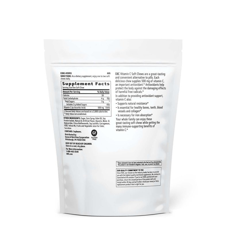 - GNC Vitamin C Soft Chews - Orange: Get The Immune Supporting Benefits of Vitamin C* GNC Vitamin C Soft Chews are a great-tasting and convenient alternative to pills. Each delicious chew supplies 500mg of vitamin C, an important antioxidant.* Antioxidants help protect the body against the damaging effects of harmful free radicals.* In addition to providing antioxidant support, vitamin C also: Provides 500mg Vitamin C per serving