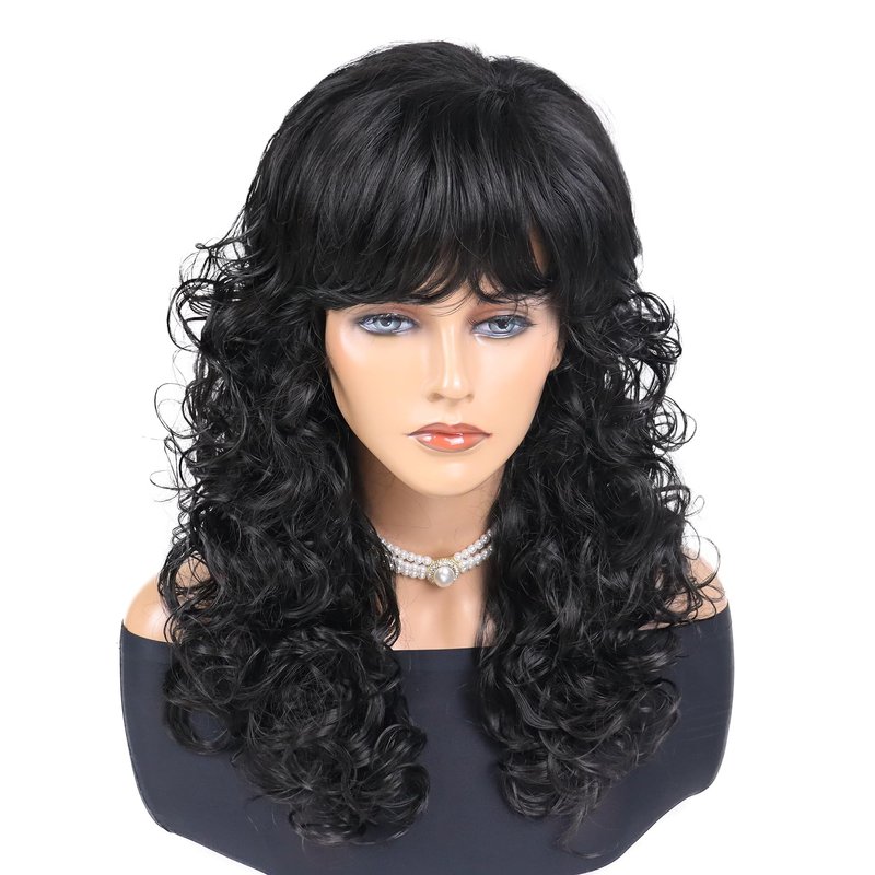 - Crafted with heat resistant fiber, this black womens wig with bangs is ideal for women seeking a comfortable and durable solution. With its tangle-resistant properties, this curly wig ensures a hassle-free experience while maintaining a realistic appearance. Stand out in style with this chic and natural-looking long wig.