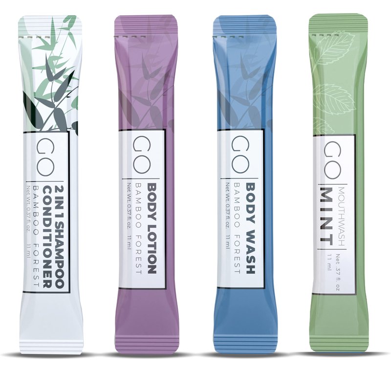 - Handy Pack of 20: Each purchase gives you 20 individual packets 5x of each of GO Essentials Travel Size Shampoo and Conditioner Packets, Travel Size Body Wash Packets, Travel Body Lotion and Mouthwash enough to last through you multiple trips and or for your whole family. Our single-use 2:1 Shampoo and Conditioner packets come in compact, leak-free, and robust packaging :muscle: making them ideal for both personal use and professional use.