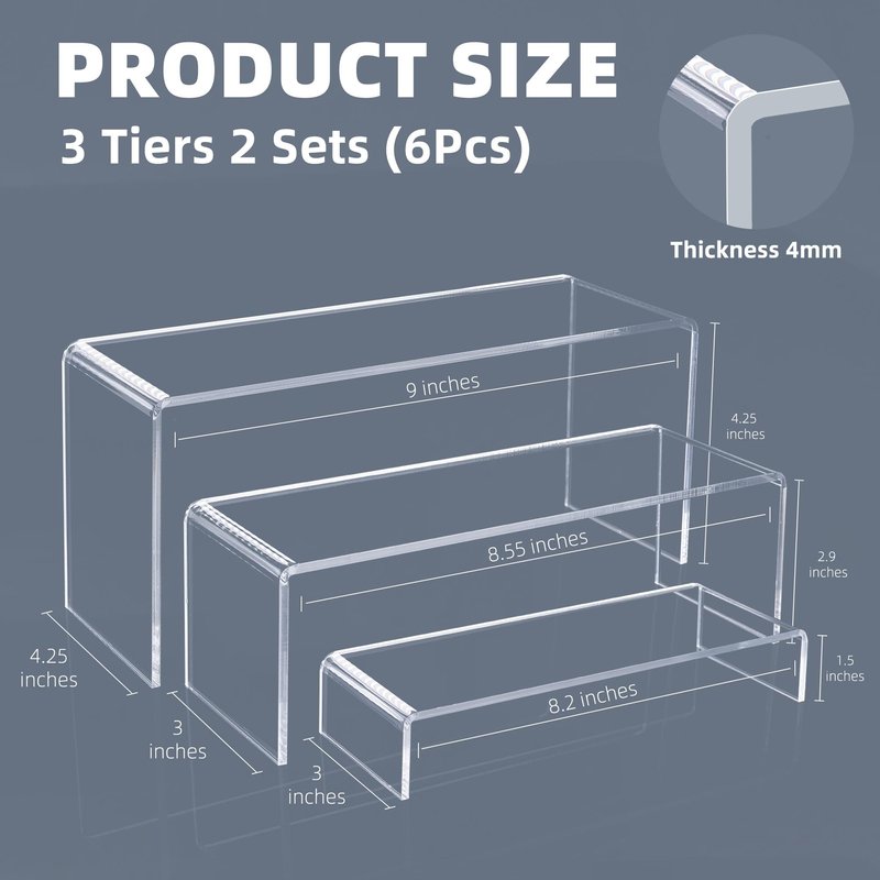 - [Pectfect Service] 2 set 9x3x4.25inch, 8.55x3x*2.9inch and 8.2x3x1.5inch U shape rectangle transparent acrylic display risers, each set contains 3 pieces display risers in 3 different sizes, 6 pieces in total, if you have any question please concact us,we will try our best for you to deal with the problem in 24 hours.
