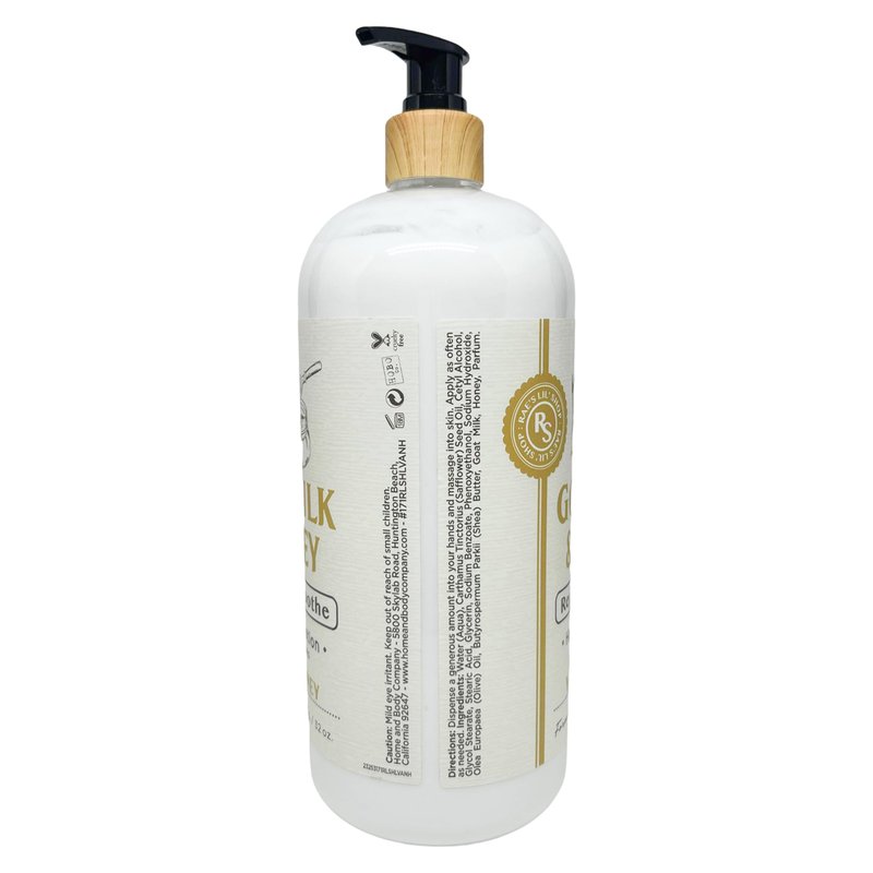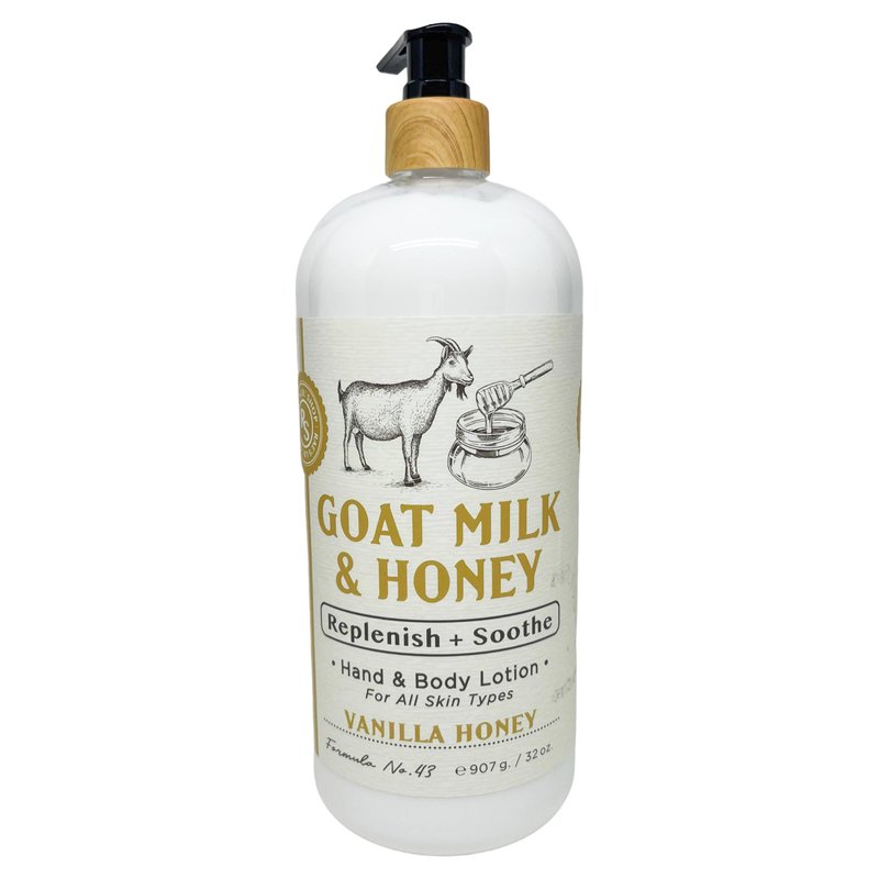 Goat milk & honey replenish and soothe hand and body lotion. For all skin type. Vanilla honey 907 g. / 32 oz. Dispense a generous amount into your hands and massage into skin. Apply as often as needed.
