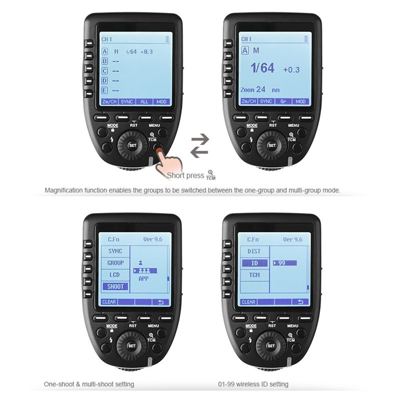 - Smart TCM function for transform the TTL shooting value tinto the output value in M mode by Long Press TCM Button, Switch between the One-Group and Multi-Group Mode by Short Press TCM Button