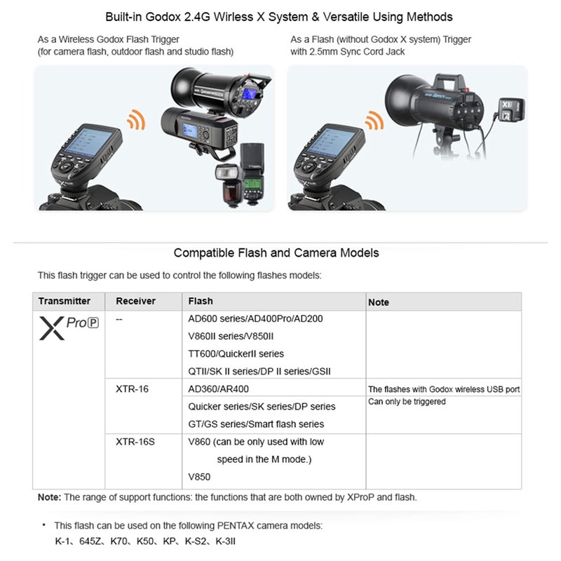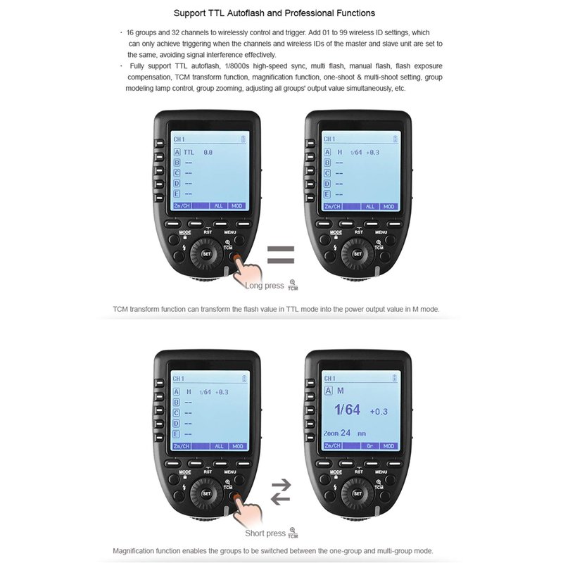 - Xpro-P TTL Wireless Flash Trigger can control the flashes with built-in Godox wirelesss X system, e.g. cameras flashes, outdoor flashes and studio flashes