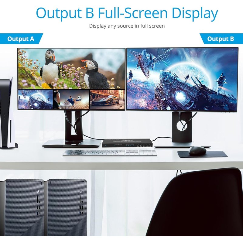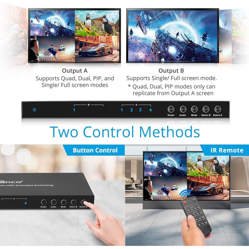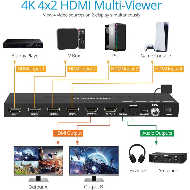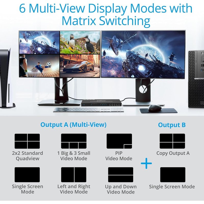 - 4x2 MULTIVIEWER & MATRIX – Simultaneously view four video sources on two big displays with multiview and matrix switching functions. Supports seamless switching: Output A (all modes); Output B (when mirrored with Output A)