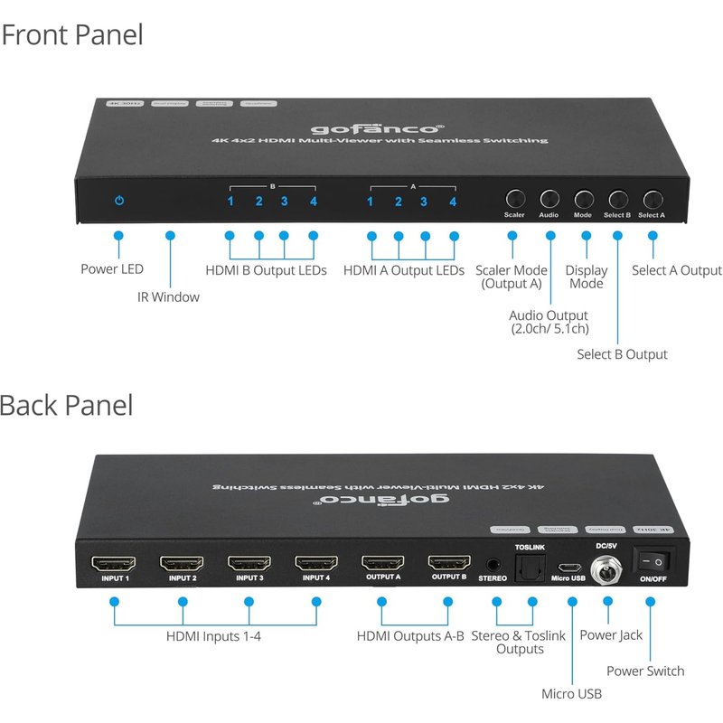 gofanco 4K 4x2 HDMI MultiViewer w/Dual Displays – 4 Inputs & 2 Outputs, 4K@30Hz, Seamless Switching, Quadview&Quad/Dual/Single/PIP, Mirrored/Matrix Outputs,Toslink/3.5mm Audio Extract(QuadView4K-Dual)