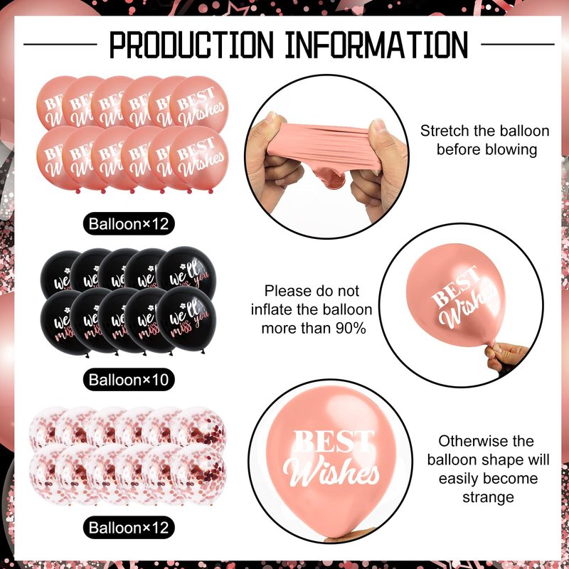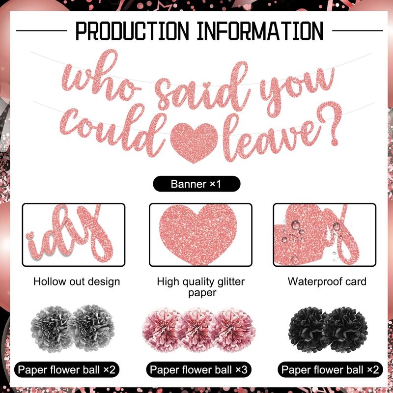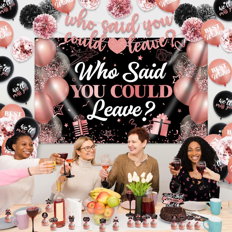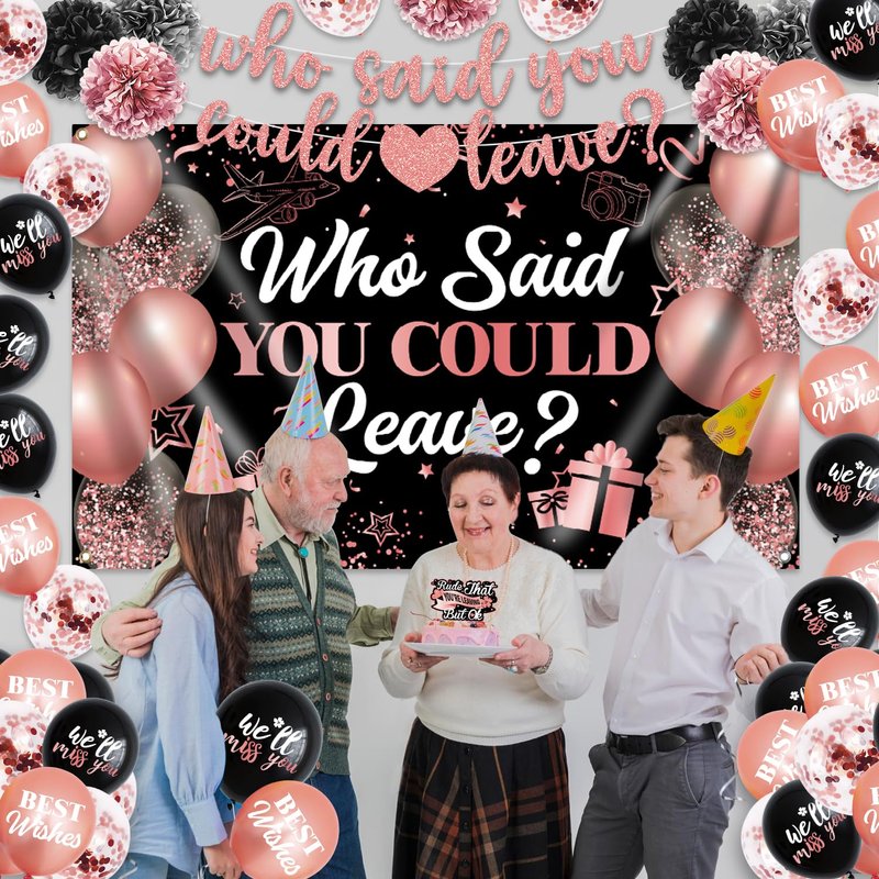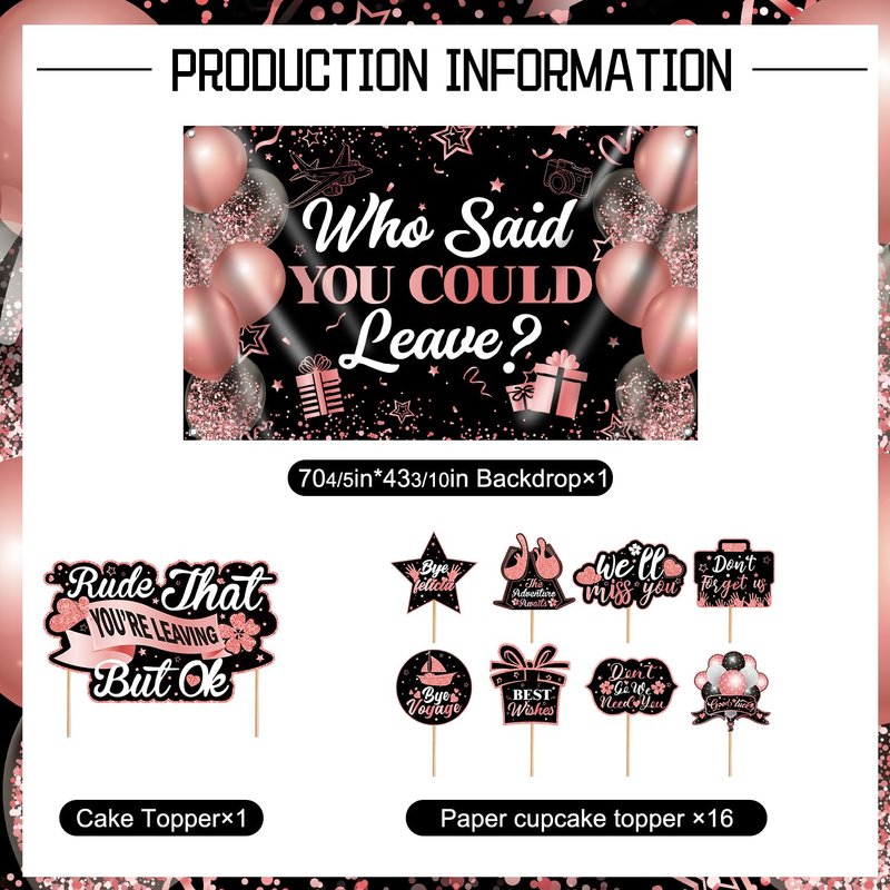 - Package includes: This we will miss you decorations contains a gold glitter who said you could leave banner, 1pc who said you could leave decorations backdrop, 1 pcs cake topper, 16 pcs cupcake toppers, 34pc retirement decorations balloons and 7 pcs tissue paper pompoms in 3 different colors(rose gold, black and grey). Our farewell decorations party for women and men can bring you a nice mood and deliver a reverent festive atmosphere, springing into the go away party more fun