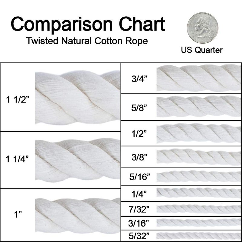 Tired of not getting true, 100% Cotton rope? Most ropes today are sold as "cotton", but contain polyester or acrylic (basically plastic) fibers, instead of the natural cotton fibers you were promised and expected. When it isn’t real cotton through and through, it changes how the rope behaves. GOLBERG’s Twisted 100% Cotton Rope is GENUINE Cotton, and nothing but that! Made from pure, USA-grown, natural cotton fibers create a for a strong, sturdy rope that's perfectly safe for pet toys, pet leashes, horse leads and halters, other ranch animals, birds, and cat toys. In addition to using it with animals, it’s great for wedding or household décor DIY projects, and anything else you can imagine. You might have had a hard time dying other "cotton" ropes, but not with GOLBERG’s Triple Twisted 100% Natural Cotton Rope. Our rope is untreated, unbleached, undyed and made entirely from natural fibers which means it will easily take on any color you choose to dye it with. Pure cotton fibers are fast-drying and naturally high-strength and low stretch making it great for any task whether it be DIY or crafting or as a tent line. Soft in the hand yet tough enough to withstand practically anything you throw at it, this twisted cotton rope is great for your pet, your DIY craft projects, your farm or ranch, your tent, tug of war, tire swing rope, curtain ties, jewelry, handles, bins, and so much more! GOLBERG’s 100% Twisted Cotton Rope is available in widths of 5/32", 3/16", 7/32", 1/4", 5/16", 3/8", 1/2", 5/8", 3/4", 1", 1 1/4" (1.25”), and 1 1/2" (1.5”); and in lengths of 10', 25', 50', 100’, 300', and 600’. GOLBERG only sells premium products and refuses anything sub-par so you know it's made from top-quality materials (grown right here in the USA!) and backed by the GOLBERG guarantee. NOTE: each length is finished with high quality tape to ensure that it doesn’t unravel.