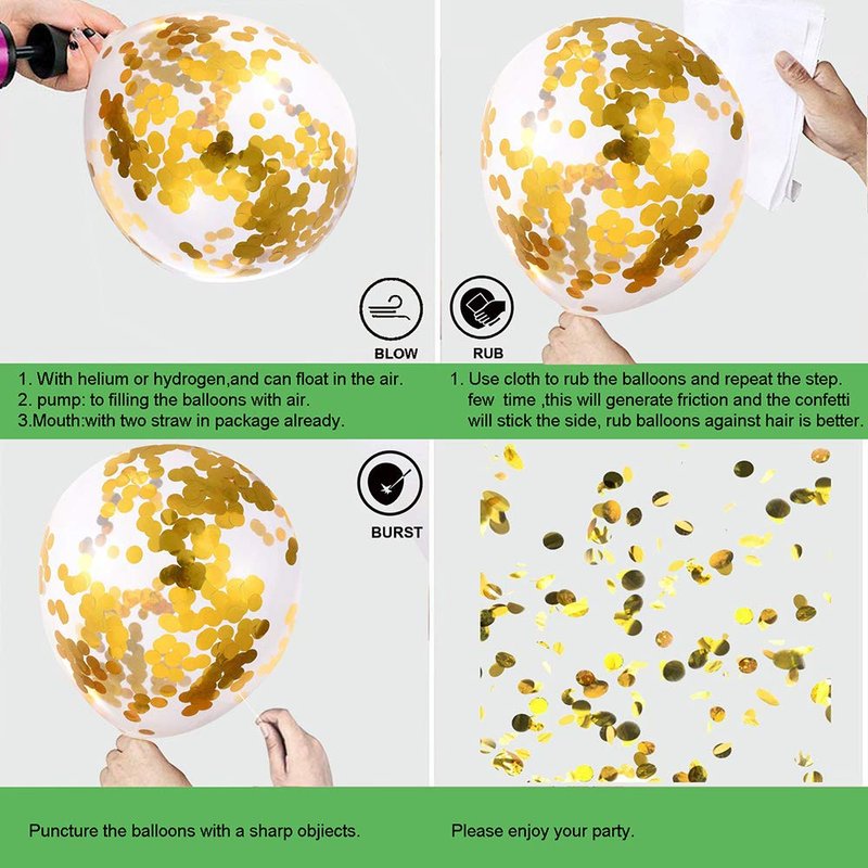 - 4.PARTY TIP - we recommend that you fill these with helium, It can float after inflated with Helium, If you use air, they will not float and can be put anywhere.to other beautiful gold confetti balloons,You can easily inflate by blowing, then tie or tape the foil balloon to the wall or anywhere! Note:Please gently rub the confetti balloon on the dry towel, carpet or your hair to get the static electricity, then shake it slowly to make these colorful pieces stick on the sides of the balloon.