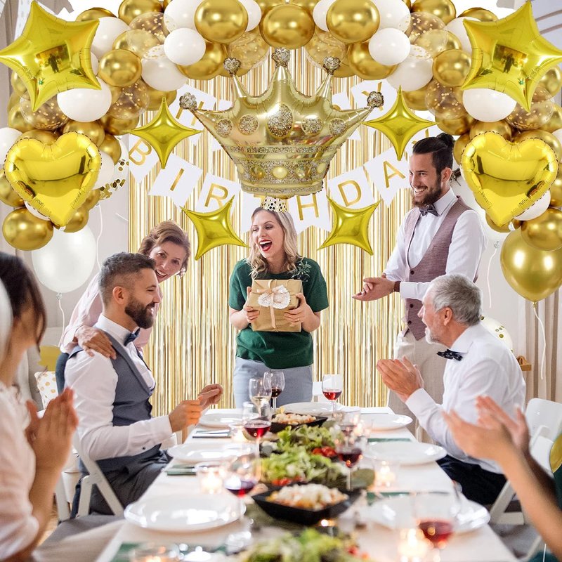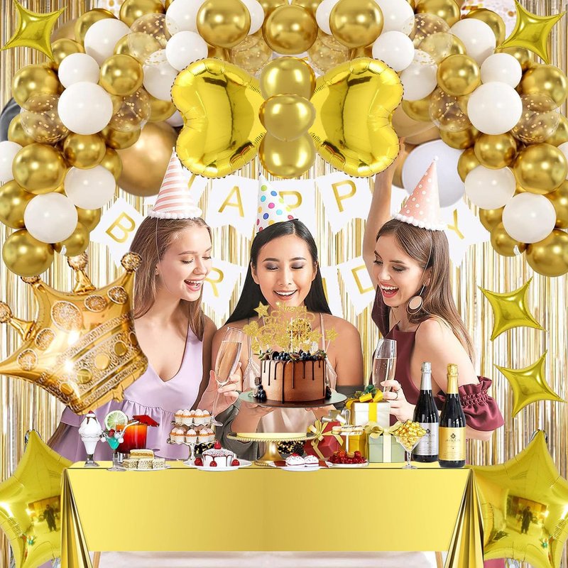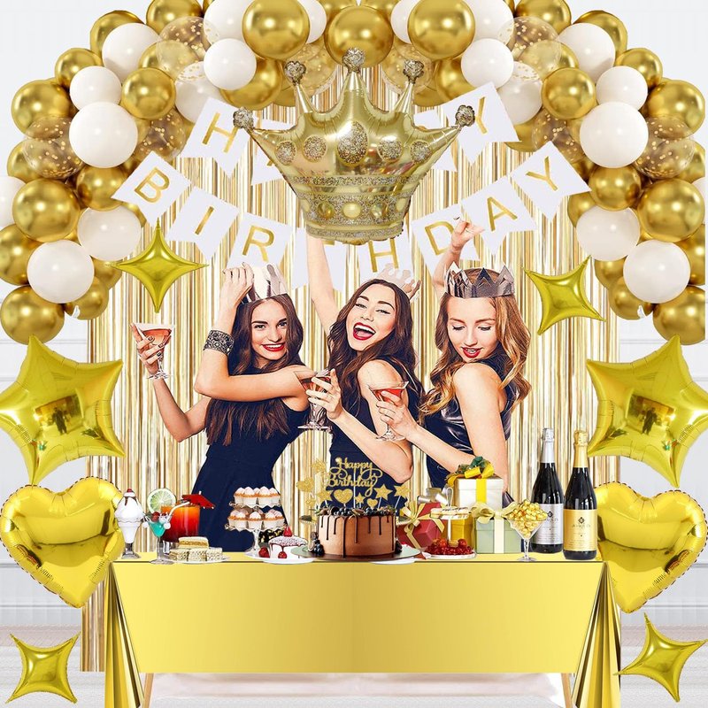 - Extensive Variety: This pack includes: 1 x “Happy Birthday” Banner 1 x Foil Fringe Curtains 1 x Gold Tablecloth 1 x Crown Balloon 4 x Star Foil Balloons 10 x White Balloons 20 x Gold Metal Balloons 6 x Gold Confetti Balloons 2 x Gold Star Balloons 2 x Gold Heart Balloons 1 Set Cake Topper Everything you need for a stunning celebration!