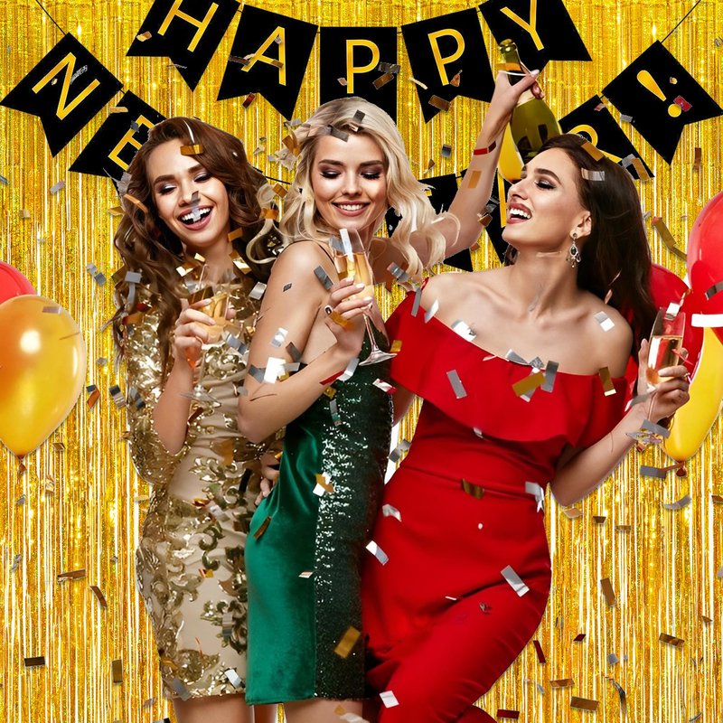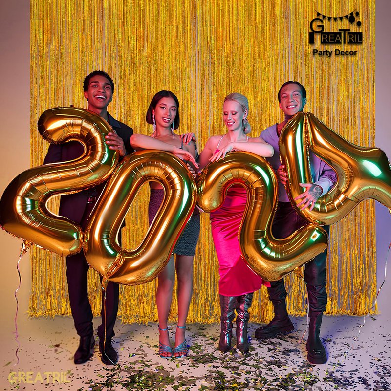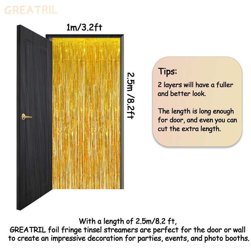 - Pack of 2, 3.2 ft x 8.2 ft for each. With a length of 8.2 feet, GREATRIL foil fringe tinsel backdrops are used for the doors or wall to create an impressive decoration for parties, events, and photo booths.