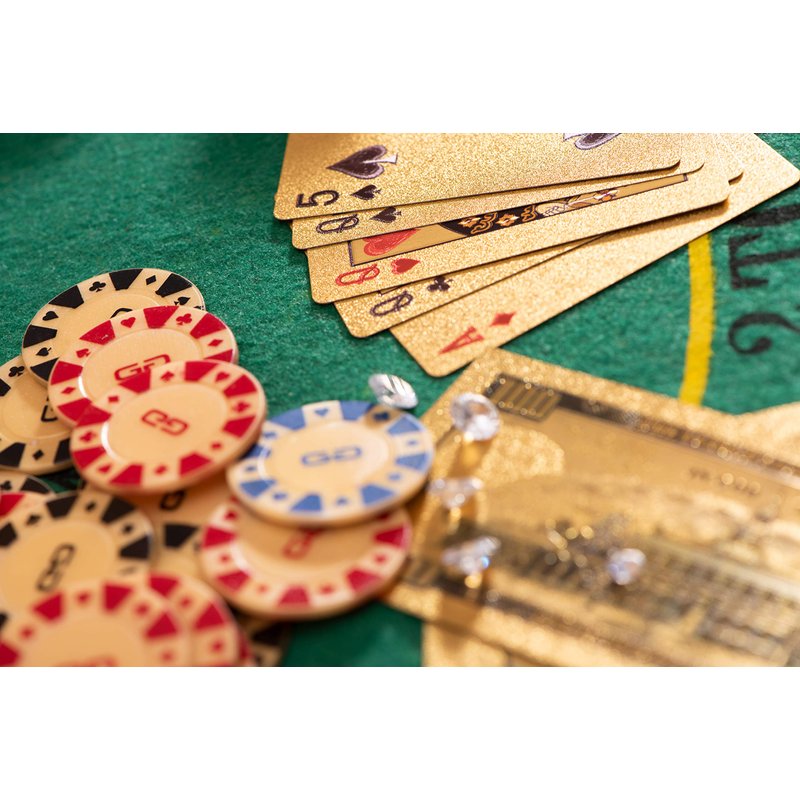 - INCLUDES – 100 gold poker chips and 2 decks of gold water-resistant playing cards.