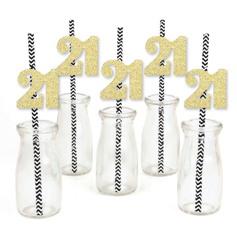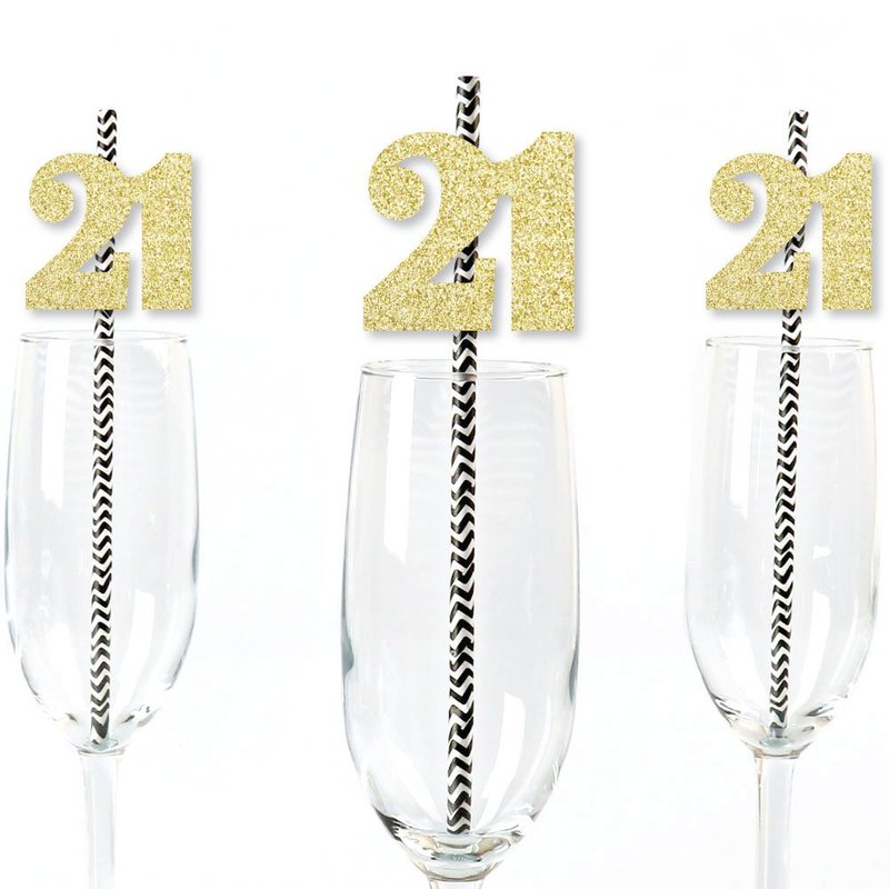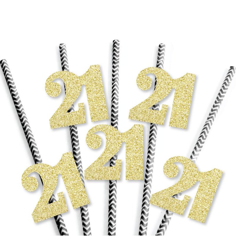 - Gold Glitter 21 Party Straws INCLUDES 24 no-mess real gold glitter cut-out number 21s, 25 black party straws and adhesives. Party straw décor is ideal for a 21st birthday party or anniversary party.