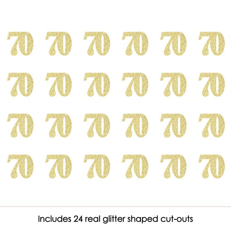 - Gold Glitter Number 70 Confetti INCLUDES 24 no-mess real gold glitter cut-out number 70s for a 70th birthday party or anniversary. Number 70 gold confetti is cut from no-mess glitter paper, making them perfect for table decorations and ensuring easy clean up.