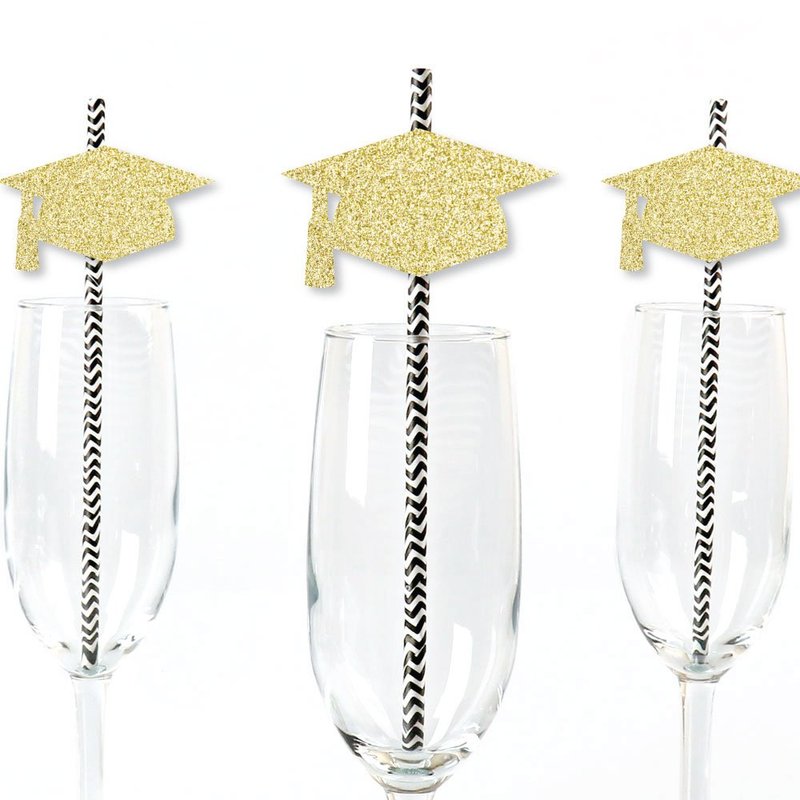 - Gold Glitter Grad Cap Party Straws INCLUDES 24 no-mess real gold glitter cut-out shape grad cap, 25 black party straws and adhesives. Party straw decor is ideal for a graduation party.