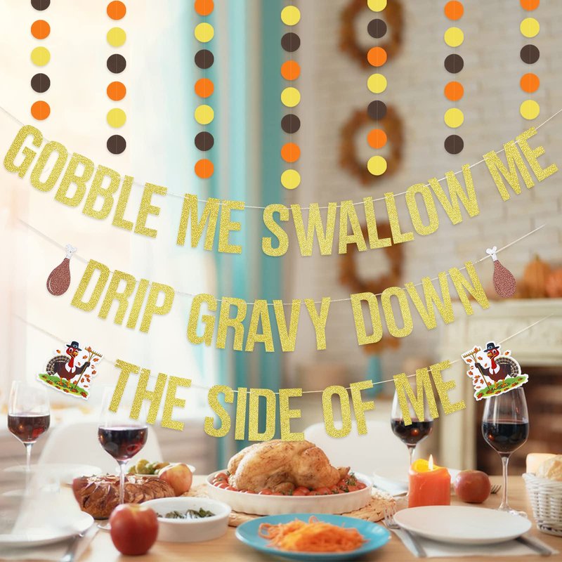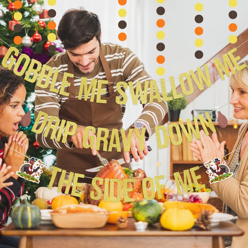 - What you will get: 1Pcs glitter Gobble Me Swallow Me Drip Gravy Down The Side Of Me banner and 1pcs circle dots garland,full of Thanksgiving feeling.It is a must-have garland to celebrate your Thanksgiving party, brighten up your home party.