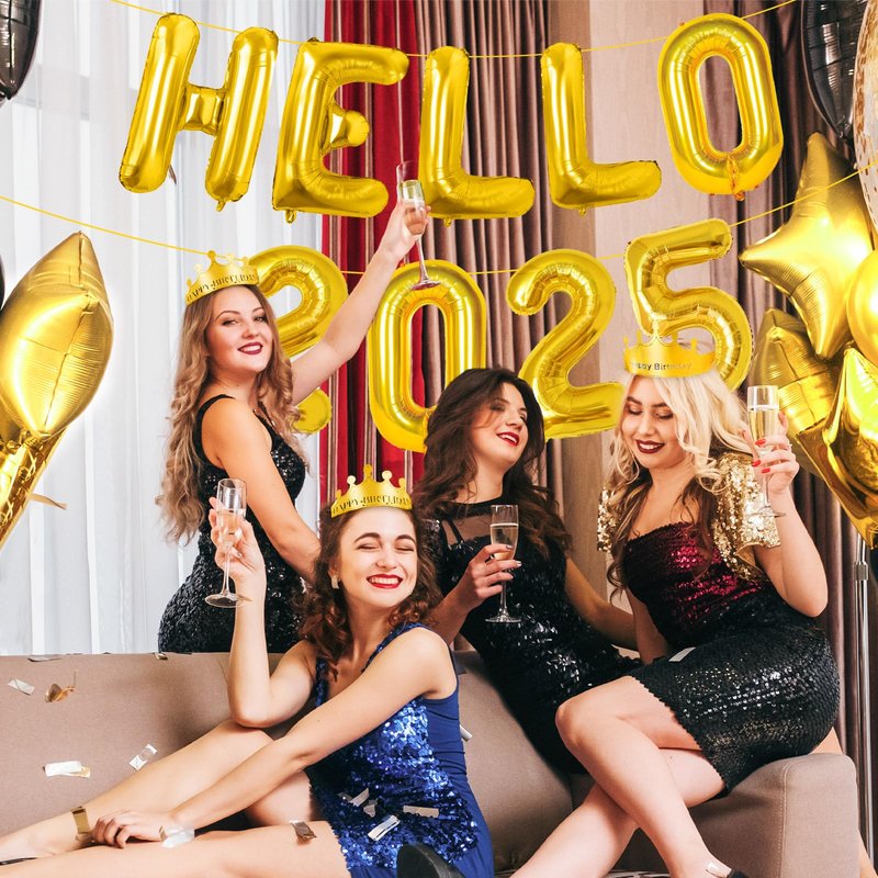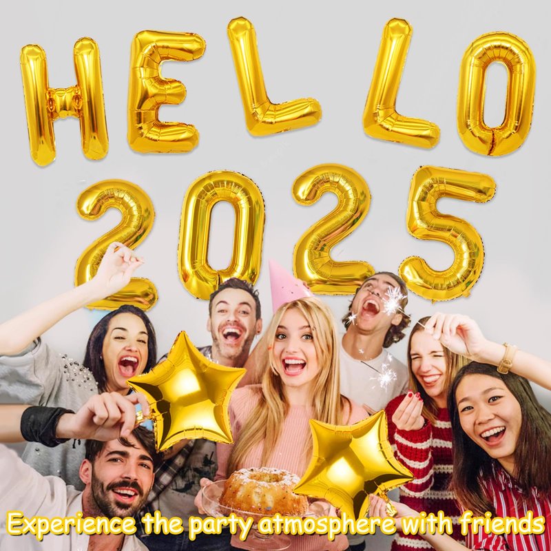 - 🧨【Gold Hello 2025 Balloons 】Our gold 2025 balloons includes 16” Number 2025 Balloons, 16” "HELLO" balloons ,2pcs 18” Star Balloons, 1pc Inflatable Straws, 20pcs glue dots and 32ft Ribbon. Celebrate the final toast of the year with gold happy new year 2025 balloons. This shimmering colors of 16” new year balloons 2025 will create a sparkling and classy effect for your happy new year decorations 2025. Light up an excitement for NYE decorations 2025 and new years eve party supplies 2025.