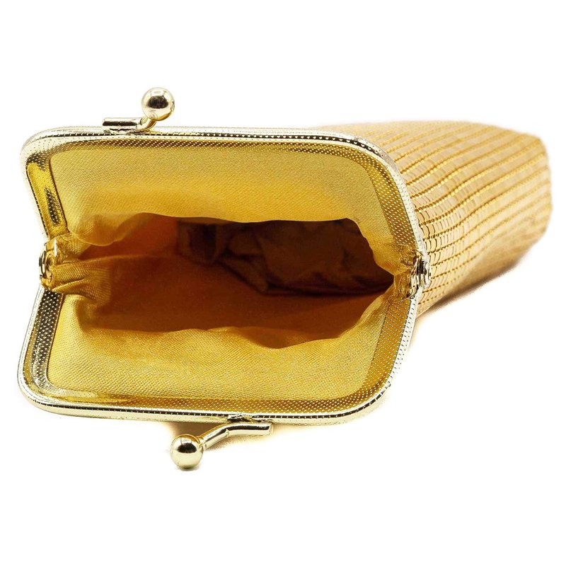 This Gold mesh cigarette purse has a sleek padded silk inner layer that accentuates the shine of the outer mesh casing. This cigarette purse will hold a full pack of 100s or Kings size cigarettes. Kiss lock clasps keep the purse sealed and contents secured inside.
