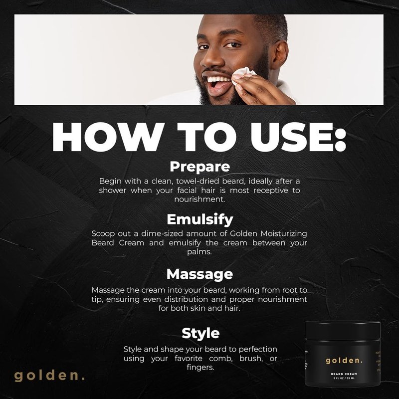 Introducing the Golden Moisturizing Beard Cream - the secret weapon for your facial hair game. Our specially crafted beard cream is here to revolutionize your grooming routine, unleashing the true potential of your beard with a touch of wit and charm. Say goodbye to the incessant itchiness and irritation that can plague your beard journey. Our plant-based beard cream is your knight in shining armor, moisturizing and soothing every strand of hair. Say hello to a softer, more comfortable beard that invites others to indulge in its touchable glory. But that's not all – our beard cream is a styling superstar. Tame those unruly whiskers with ease, as our lightweight formula effortlessly shapes and sculpts your beard, transforming it into a work of art. No more battling with a wild and rebellious beard – embrace a groomed and polished look that will leave others green with envy. Short beard, long beard, in-between beard - our versatile beard cream doesn't discriminate. It adapts to your beard's length, providing the nourishment it craves, giving you a luscious and healthy beard that commands attention wherever you go. All hail the majestic beard! Hydration is the key to a flourishing beard, and our beard cream is armed with the power to quench its thirst. Wave goodbye to dryness and discomfort, as our formula deeply hydrates your skin and whiskers. Experience the joy of a well-hydrated beard that feels as refreshing as a cool breeze on a sunny day. Embrace a natural and authentic grooming experience with our beard cream. Made from the finest ingredients, untouched by harsh chemicals or artificial additives, your beard will feel loved and cared for like never before. Unlock your beard's potential with the Golden Moisturizing Beard Cream. Indulge in the benefits of a nourished, dapper, and irresistibly touchable beard that will make heads turn. It's time to take your grooming game to new heights. Trust us, your beard will thank you.