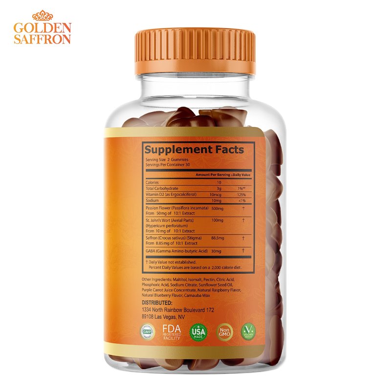 - Top-notch ingredients -- Saffron (88.5mg), GABA (30mg), Passion Flower (500mg), St. John's Wort (100mg), and Vitamin D2 (100mg) are all known for their potential benefits for body and mind. By incorporating these top-quality ingredients. Our product aims to provide a natural and effective way to support your overall health and well-being.