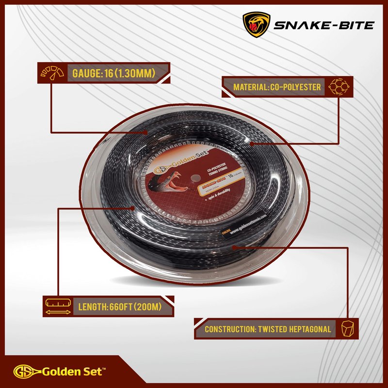 Golden Set Tennis Snake-Bite Polyester Tennis String (Black, 16 Gauge Reel (660ft/200mm)