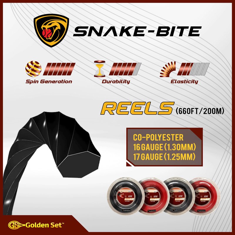 On this page you can purchase Snake-Bite in reels (one reel is enough for 18 raquets) or sets (one set is enough for one racquet). Snake-Bite, Golden Set's best selling tennis string, is a polyester optimized for spin production. It is suitable for all levels of players from beginners to tour professionals. Snake-Bite provides performance and durability equivalent to much more expensive polyesters like BabolatTM, RPM Blast.