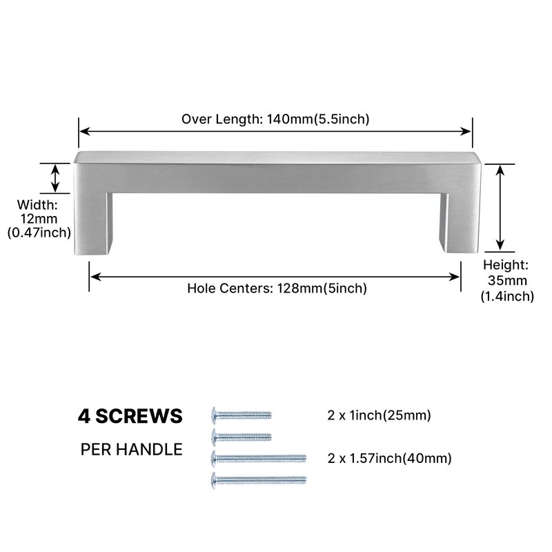 - Measurement: Hole centers:128mm(5inch), Overall Length:140mm(5-1/2inch), Width:12mm(1/2in), Thickness:12mm(1/2in), Height:35mm(1-2/5in). Please measure your cabinet or old cabinet pull hole centers carefully before purchase.