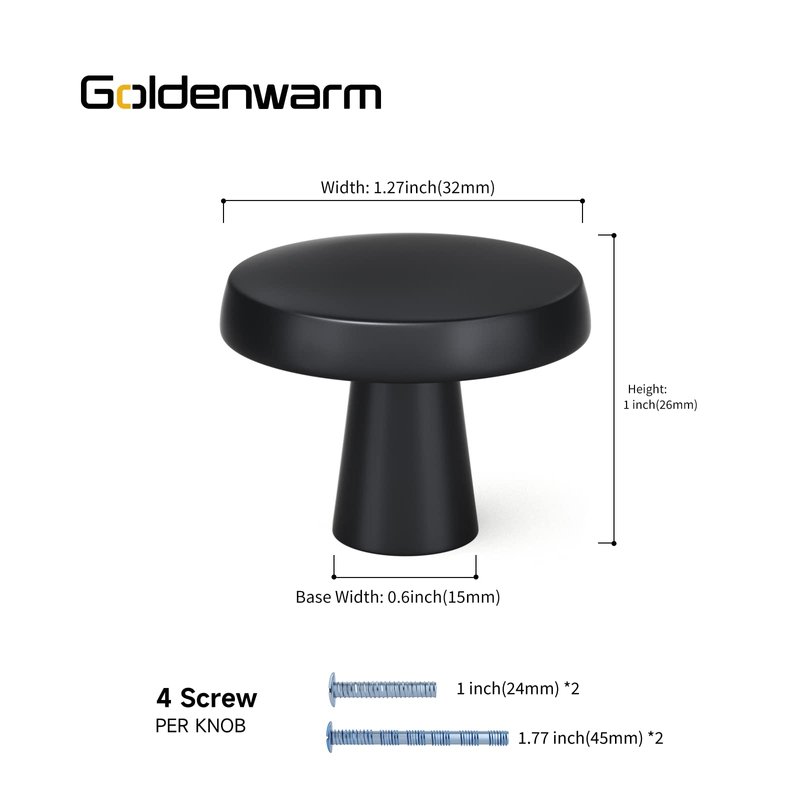 - 【Size and dimensions】: diameter of matte black knobs for cabinets: 1.27"/32mm; height: 1"/26mm; base diameter: 0.5"/12.7mm, small mushroom style.