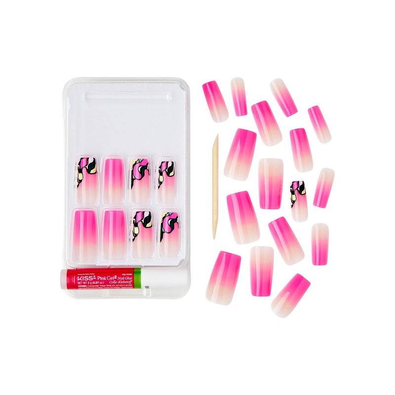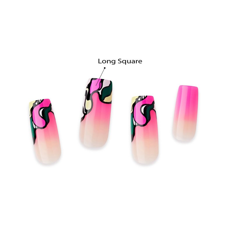 GoldFinger Trendy False Nails Kit, Long Square Design Nail, Playful Classic Vibrant Pink Abstract Print, Ready to Wear Gel & Manicure Stick included, Long-Lasting Convenient & Easy to Apply