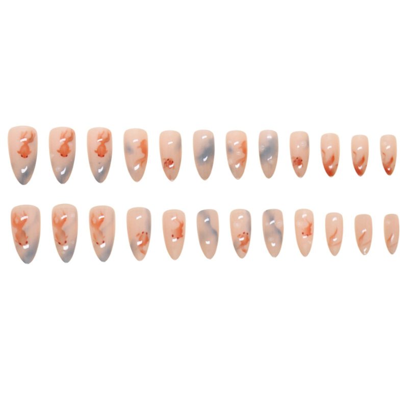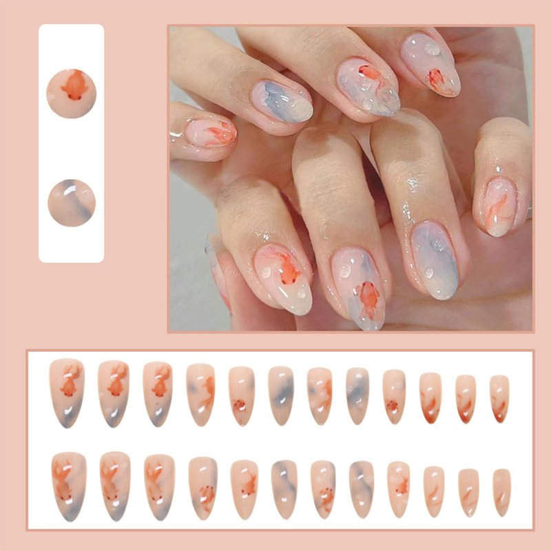 - Package Contains:You will get 24Pcs Goldfish fake nails with design press on nails in 12 sizes, 1 nail file and 24 jelly glues,1 small wooden stick.