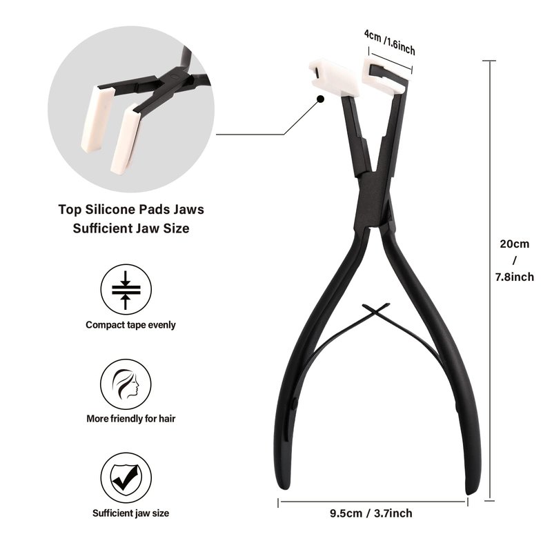 - Hair Extension Pliers Features: The Tape in hair extension plier is made of high-quality stainless steel, heat-treated for durability. It is very well constructed, sturdy and very reliable.Top silicone pads jaws, specifically made for tape-in hair extensions.