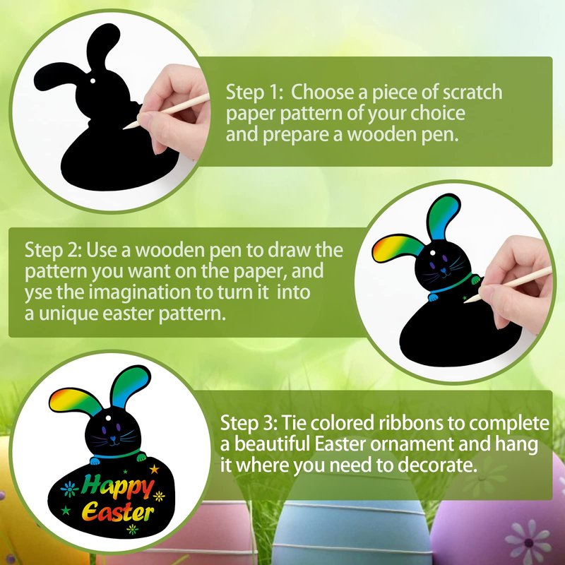 - 【Easy to use】 Just choose the scratch painting you like, use your imagination, and then gently scratch out the pattern with a wooden stick to reveal the gorgeous rainbow colors below! Each piece of scraping paper has pre-drilled holes, which can be hung with ribbons wherever you want to decorate Easter.