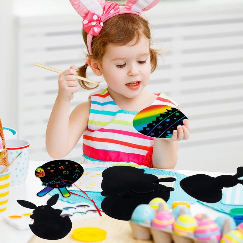 - 【Safty Drawing Materials】 These Easter draft papers use non-toxic thick cardstock with a black coating on the surface. The scratch stick is made of wood, safe, environmentally friendly, robust, and not easy to fade and deform. No peculiar smell, non-toxic powder, children can safely make colorful Easter paper signs.